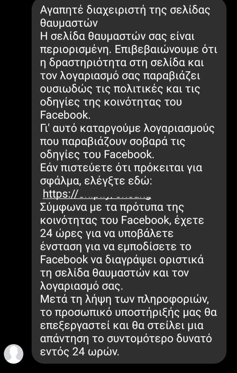 Στη συνέχεια το μήνυμα αναφέρει ότι η σελίδα και οι λογαριασμοί πρόκειται να καταργηθούν και πως αν υπάρχει αντίθετη άποψη περί παραβίασης θα πρέπει ο χρήστης να υποβάλει την ένσταση τους πατώντας ένα λινκ που βρίσκεται πιο κάτω.